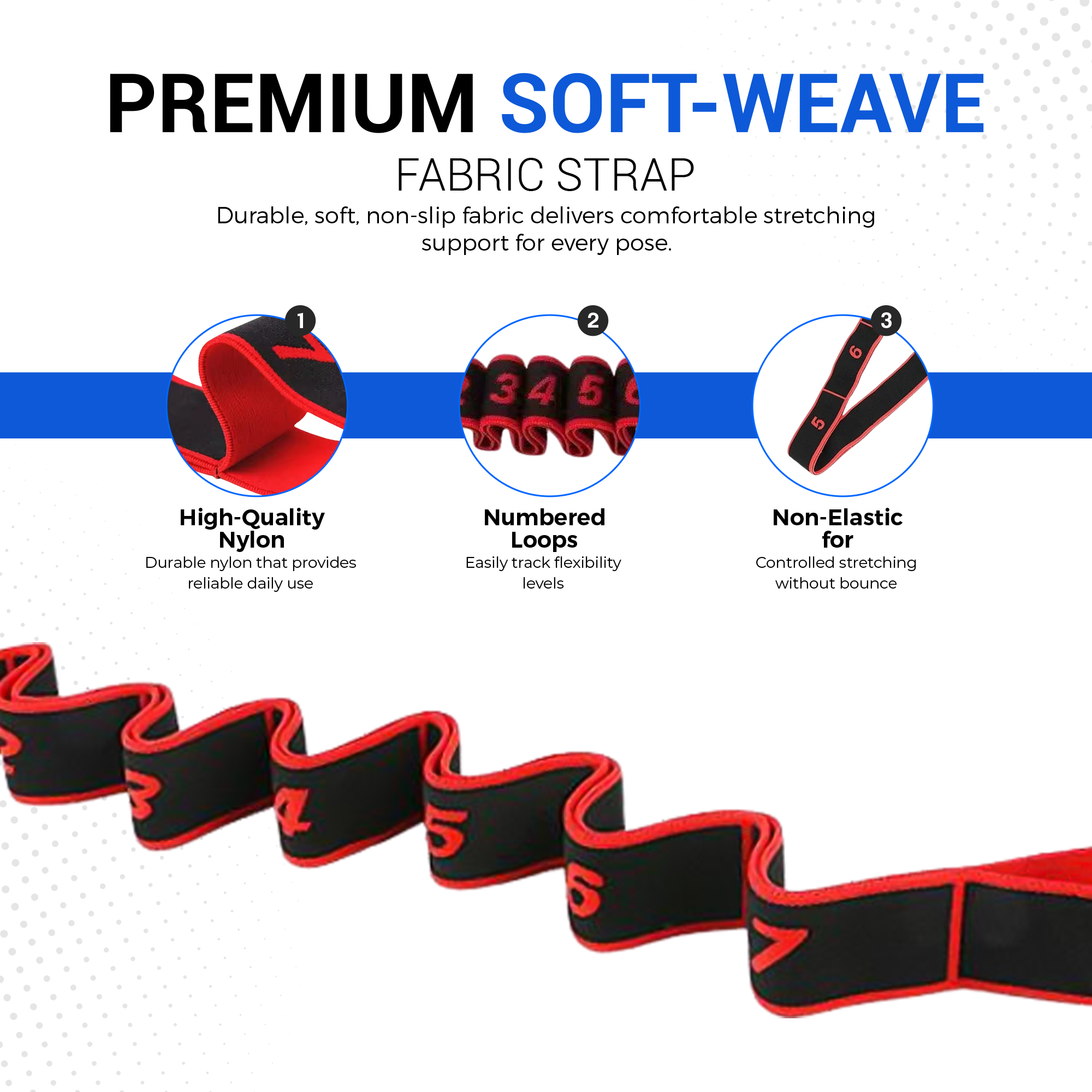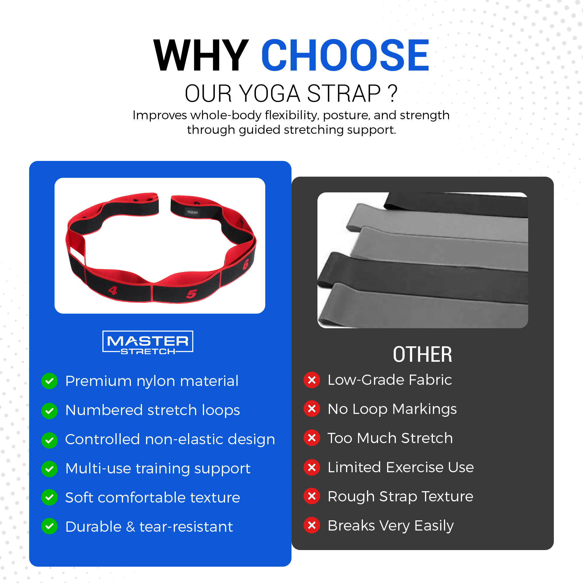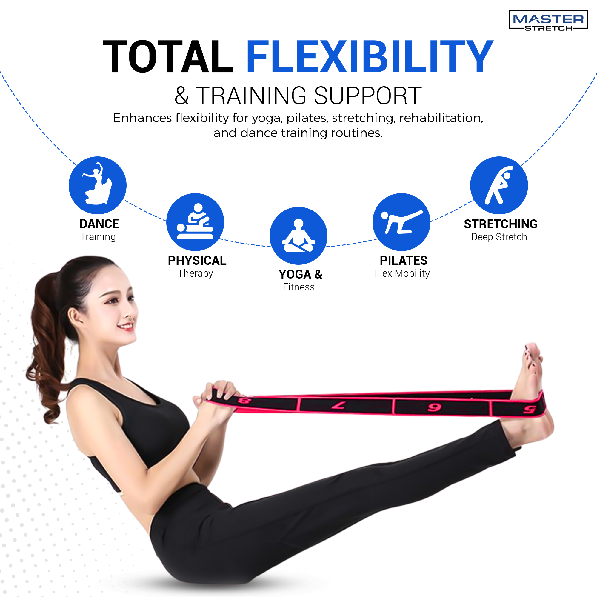 The Master Stretch Yoga Stretch Strap helps improve flexibility, mobility, and range of motion by providing controlled assistance during stretching, yoga poses, and rehabilitation exercises.